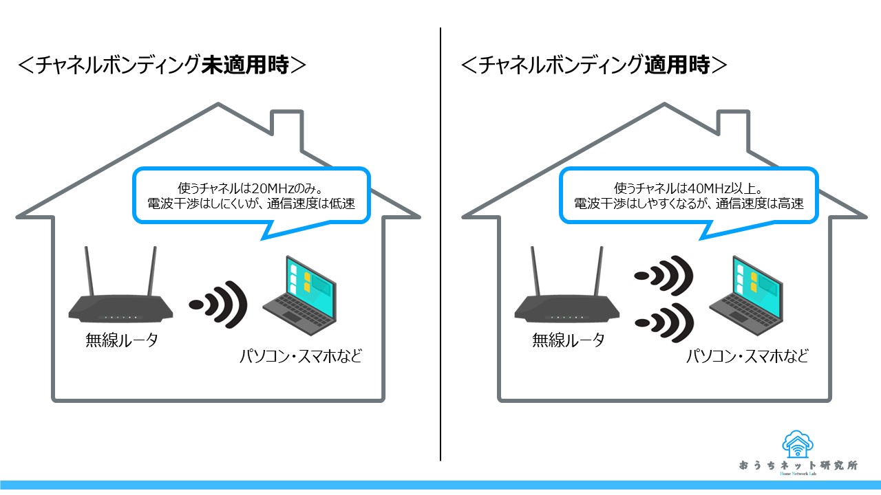 チャネルボンディングは、複数の無線チャネルを組み合わせて、より広い帯域幅を提供する技術で、Wi-Fi 4 (IEEE 802.11n)以降の規格で広く使用されています。この技術により、無線ネットワークの通信速度が大幅に向上します。